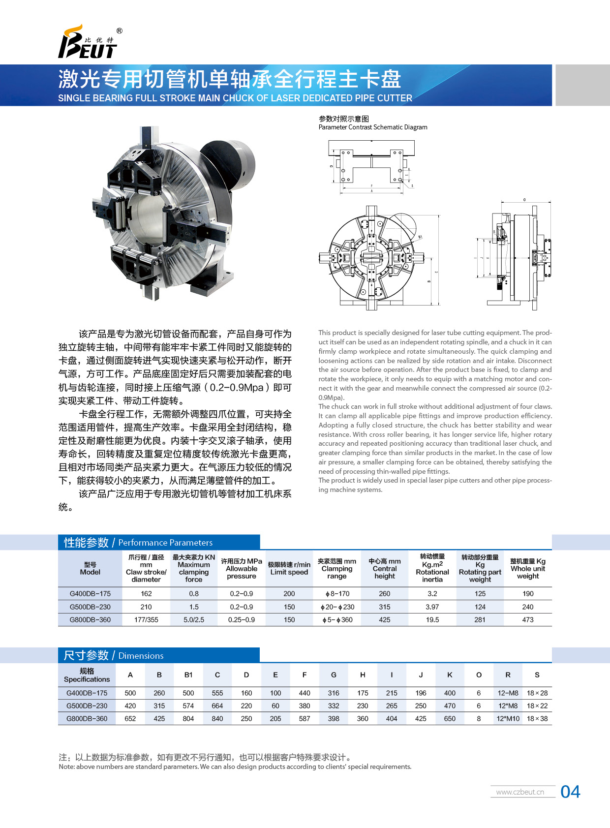 激光專(zhuān)用切管機單軸承全行程主卡盤(pán)DB款適用于激光切管設備,旋轉切割圓管、方管、橢圓管等。